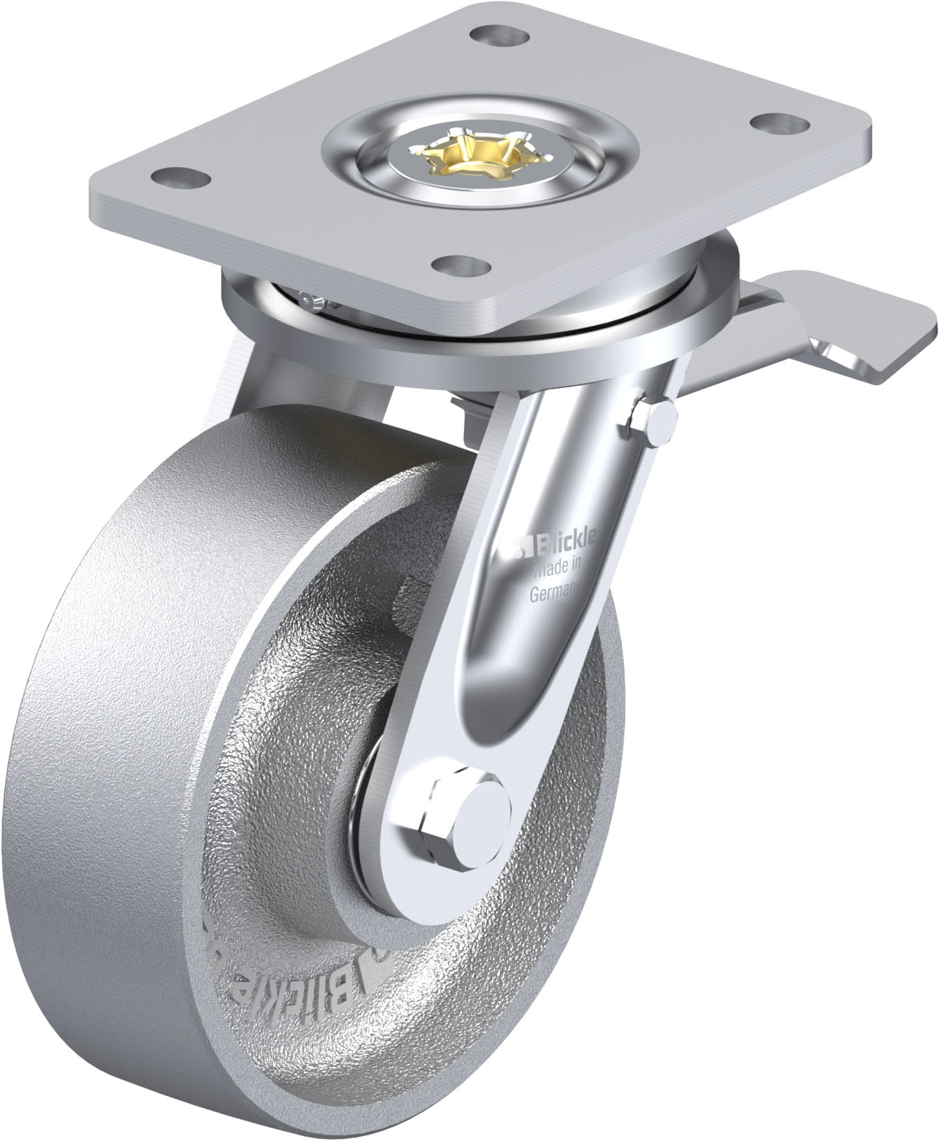 Heavy duty welded steel swivel castor, with brake system ‘stop-top’, cast iron wheel