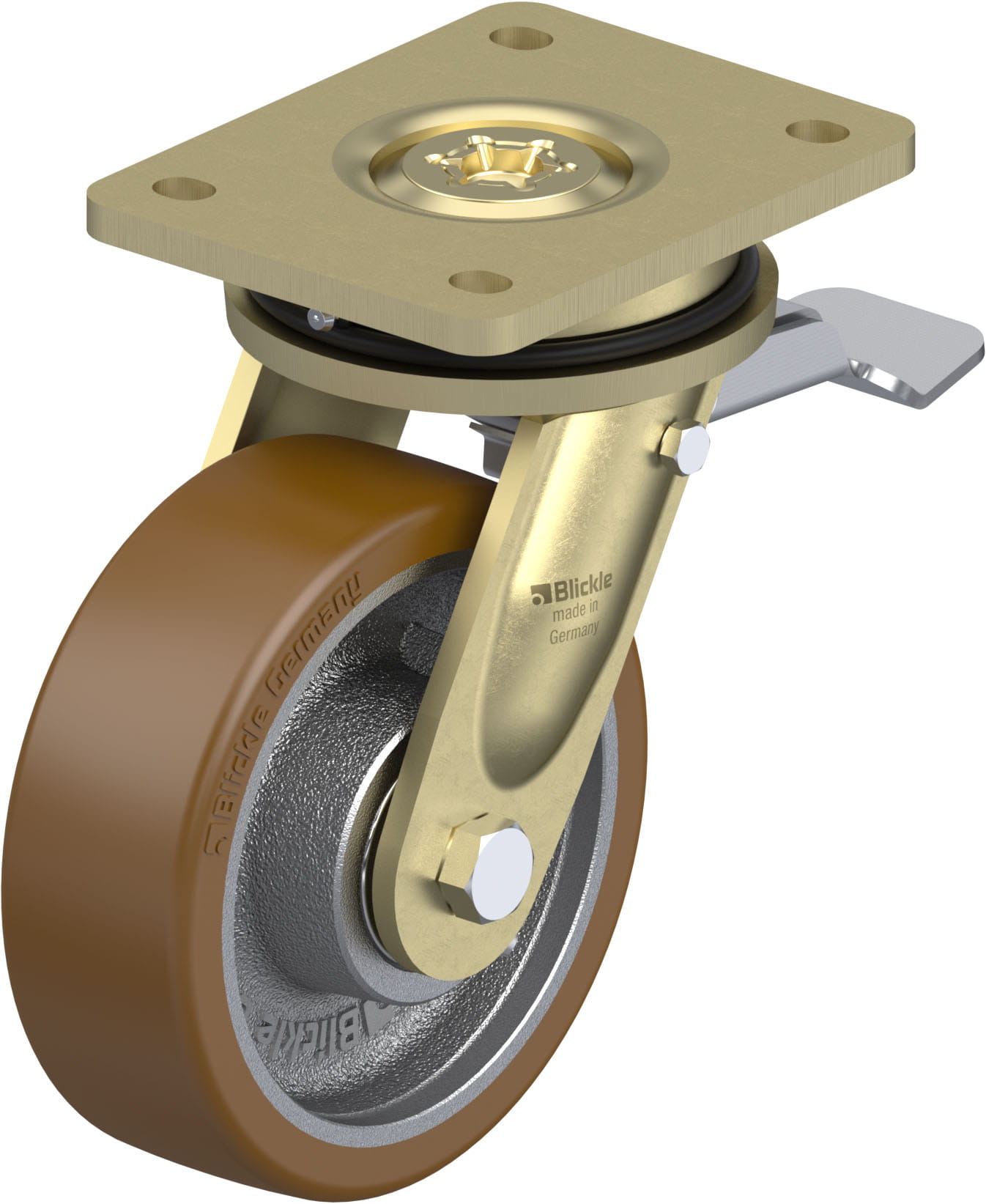 - tread: high-quality polyurethane elastomer Blickle Besthane®, hardness 92 Shore A, colour brown, non-marking, non-staining