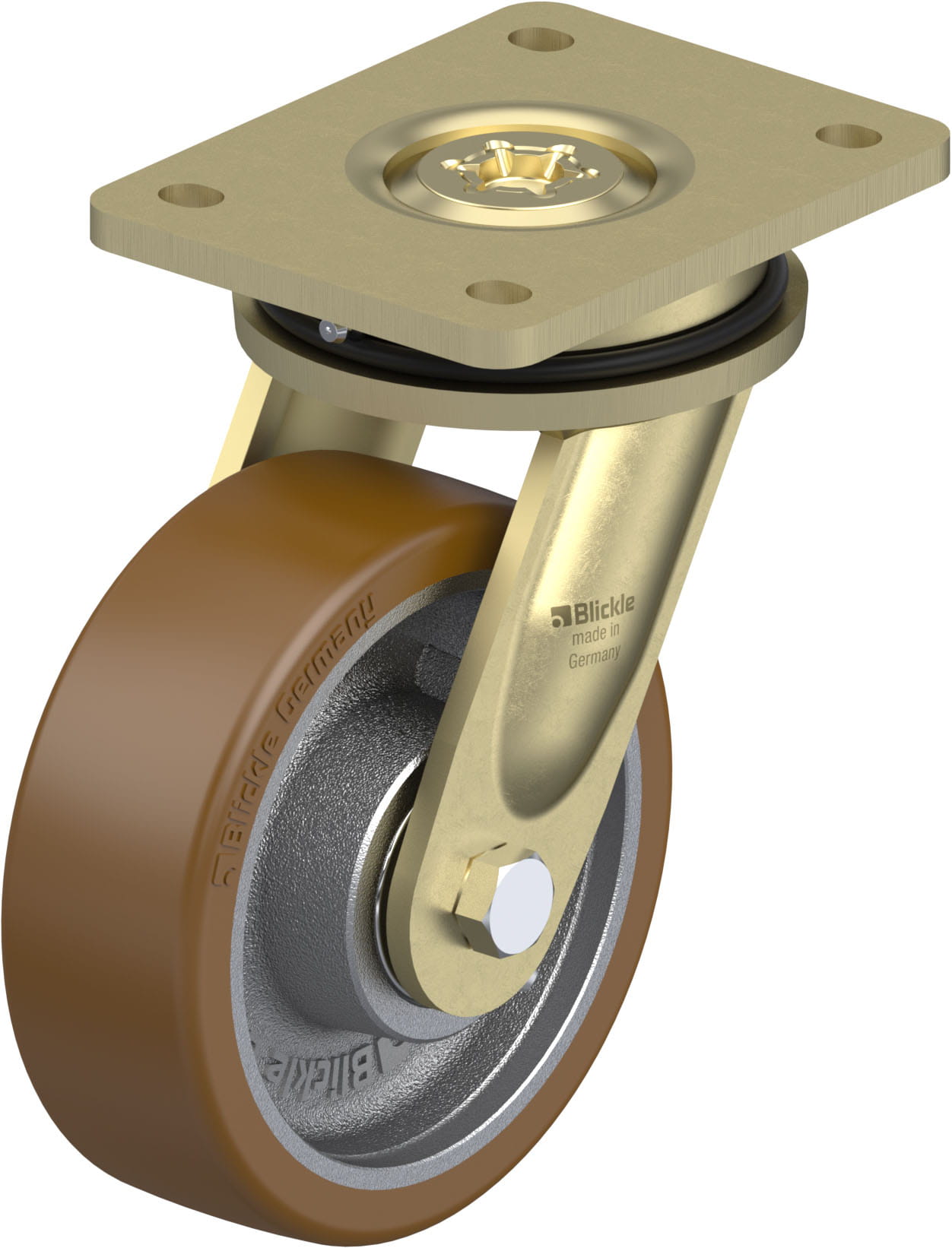 - tread: high-quality polyurethane elastomer Blickle Besthane®, hardness 92 Shore A, colour brown, non-marking, non-staining