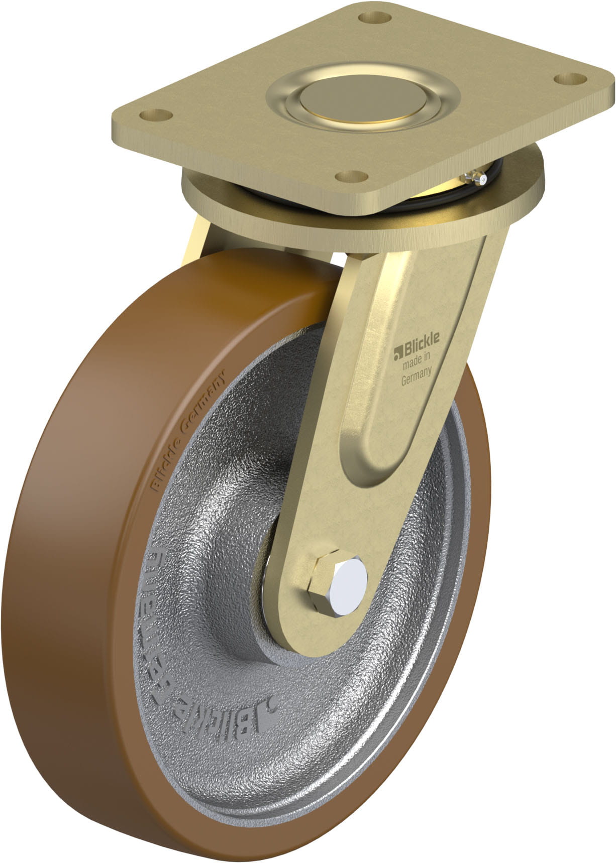 - tread: high-quality polyurethane elastomer Blickle Besthane®, hardness 92 Shore A, colour brown, non-marking, non-staining